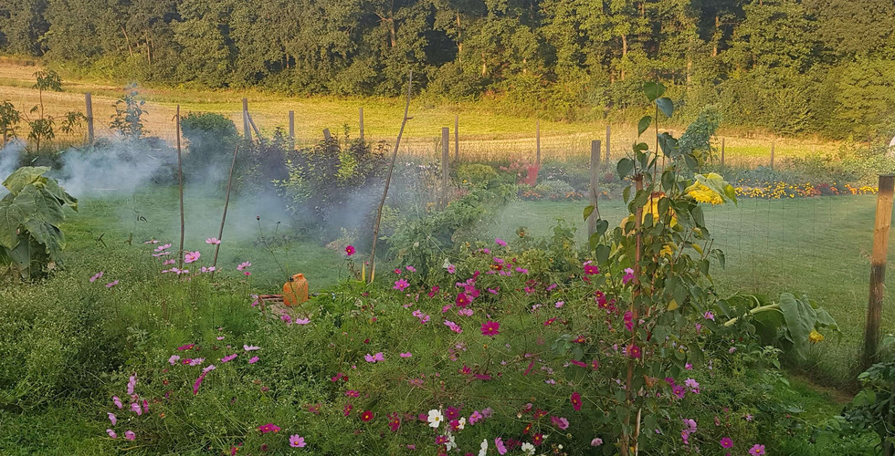 Dwie małe “podwyższone grządki” zrobione w zeszłym roku dla cukinii. W tym roku miała tam rosnąć tam papryka. Jako przedplon- sałata i rzodkiewka. Obok było trochę wolnego miejsca, więc zapragnęłam mieć poletko kosmosu. I kosmos kwitł dla nas całe lato. Niestety "kosmiczny gąszcz" wygrał z papryką walkę o światło.